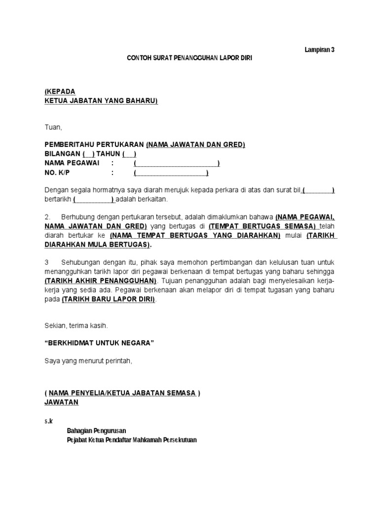 3sehubungan dengan itu pihak saya memohon pertimbangan dan kelulusan tuan untuk menangguhkan tarikh lapor diri pegawai berkenaan di tempat bertugas yang baharu. Berikut adalah contoh surat permohonan penangguhan lapor diri. Saya mengharapkan agar pihak Tuan dapat mempertimbang situasi saya disini dan menerima penangguhan tarikh lapor diri saya ini.